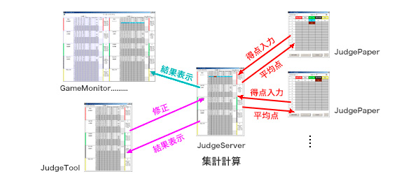 TCP/IPプロトコルを使いJudgeServer、JudgeTool、JudgePaper最大5台、 GameMonitor最大5台が通信をおこなう。 1つのプログラムで4人制、5人制ジャッジに対応させた。