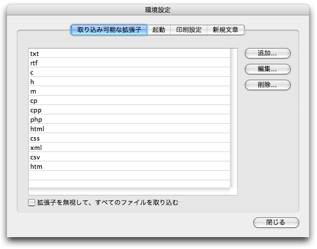 これで指定したフォルダ以下のテキストファイルがすべて取り込まれます。取り込み対象になるファイルの種類は、【文庫番】→【環境設定】を実行して「取り込み可能な拡張子」を表示することで確認できます。