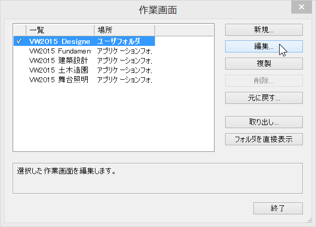 「作業画面」ダイアログが表示されます。一覧で選択されているものが、現在使用している作業画面です。 プログラムを組み込みたい作業画面を選択します。 今回は初期の画面「VW2015 Designer」を選択します。 「編集…」ボタンをクリックします。
