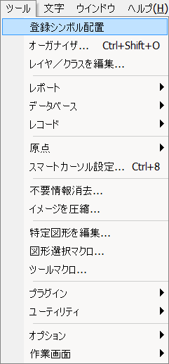 1)「ツール」メニューを開くと[登録シンボル配置]コマンドがある事を確認できます。選択し実行します。