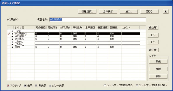 MachiningStar25では、切削の深さをレイヤ単位で設定します。 レイヤの設定を変更するだけで同じレイヤ上の全図形の切削する深さをまとめて変更できます。 レイヤでは切削の深さのほかに、切削する幅や一度に切削する量なども指定できます。